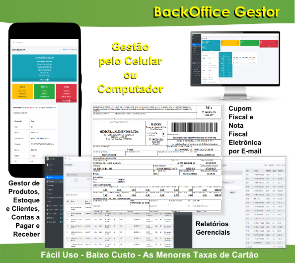 Tudo isso seja qual modelo escolher lhe permite economizar mais de 50% em hardware e software em relação as soluções tradicionais. No seu celular você pode gerenciar seus produtos e tirar relatórios ou através de um site no seu notebook. No mesmo site se cadastra categorias, produtos e estoque, retirar os relatórios de vendas, pagamentos.